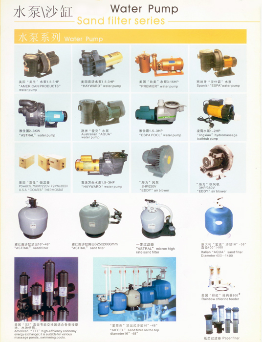 泳池及按摩池配件包括:吸污口、出入水器、溢水器、吸污蓋、主排水、激流噴嘴、按摩噴嘴、脈沖噴嘴、線座及撇渣器等。