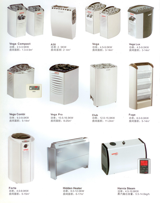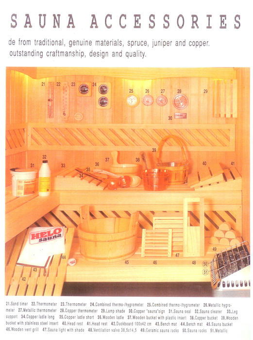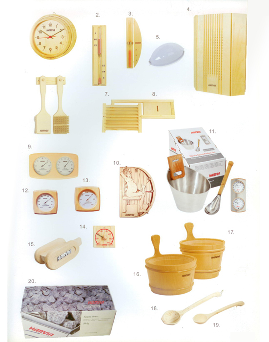 桑拿配件包括:木桶、木勺、桑拿石、桑拿鐘、溫濕度錶、爐外控器、沙漏計時器、乾蒸爐、發熱管、防爆燈、沙缸、水泵及蒸氣房等。